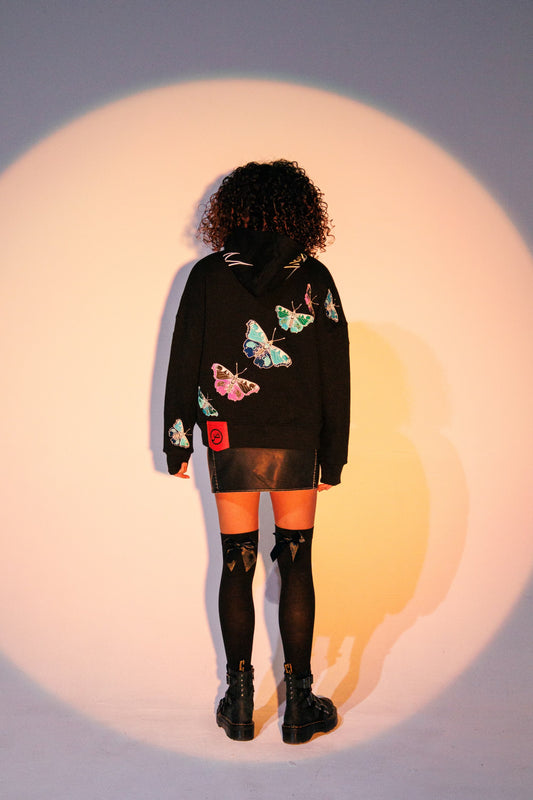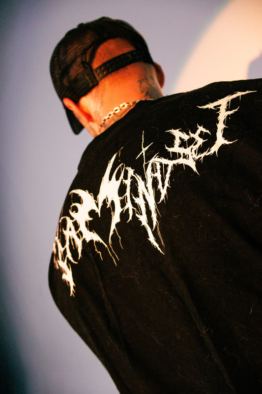 In addition to the “Dissonance” collection, the black dissonance denim set is an essential piece for achieving both comfort and style. The set is meticulously crafted with embroidered designs on waxed black denim, custom leather zippers, satin interior red lining, flared arms with interior sleeves, pyramid studs and adorned with tassels. . This set will be an invaluable addition to your collection.