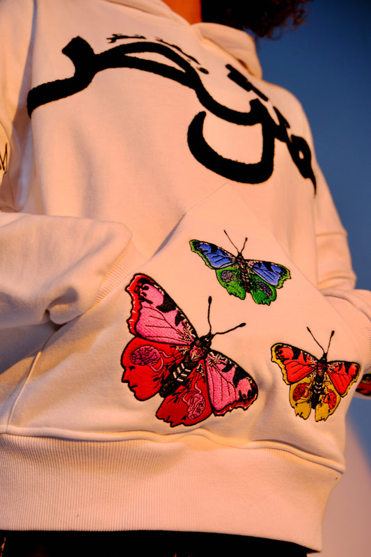 The White ‘Dissonance’ Denim set is an essential piece for achieving both comfort and style. The set is meticulously crafted with embroidered designs on white denim, with custom leather zippers, satin interior light blue lining for extra comfort in the jacket, hood and pants, flared arms with interior sleeves, pyramid studs and adorned with white and blue tassels. The pants incorporate a double pyramid pocket design on the back with Persian carpet mythological creatures embroidered throughout the pants and jacket. This set will be an invaluable addition to your collection.